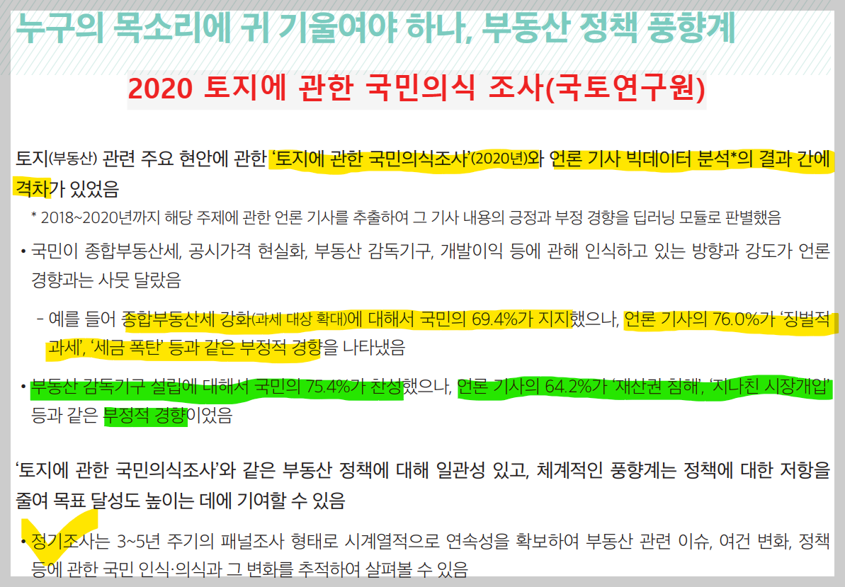 예를 들면, 국토연구원 조사에서는 종합부동산세 강화(과세 대상 확대)에 대해 국민의 69.4%가 지지했으나, 언론 기사 빅데이터 분석 결과는 76.0%가 ‘징벌적 과세’, ‘세금 폭탄’ 등으로 보도했다. 또한 부동산 감독기구 설립에 대해서는 국민의 75.4%가 찬성하는 것으로 조사되었으나, 언론 기사의 64.2%가 ‘재산권 침해’, ‘지나친 시장개입’ 등과 같은 부정적 경향을 보였다는 것이 국토연구원의 분석이다. 따라서 부동산 정책을 수립할 때는 언론보도에 의존해서는 안되고, 시계열적 연속성을 담보한 주기적 조사를 통해 국민인식을 조사하여 그 결과를 정책에 반영해야 한다고 주장했다.