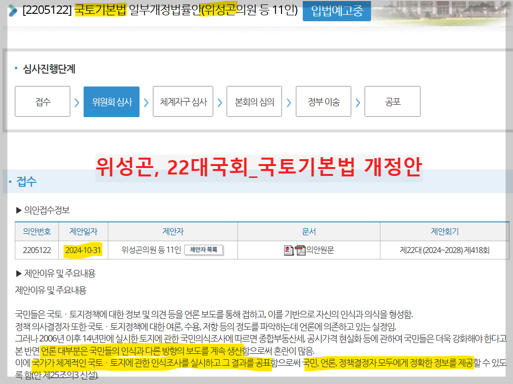 당시 국토연구원 조사 결과 및 함의를 바탕으로 '국토·토지에 관한 국민인식조사'를 주기적으로 실시해서 부동산 정책자료로 활용하자는 법안이 발의되었다. 21대국회인 2021년 11월 30일에 위성곤 의원이 발의했다. 지금부터 약 3년 전 일이다.