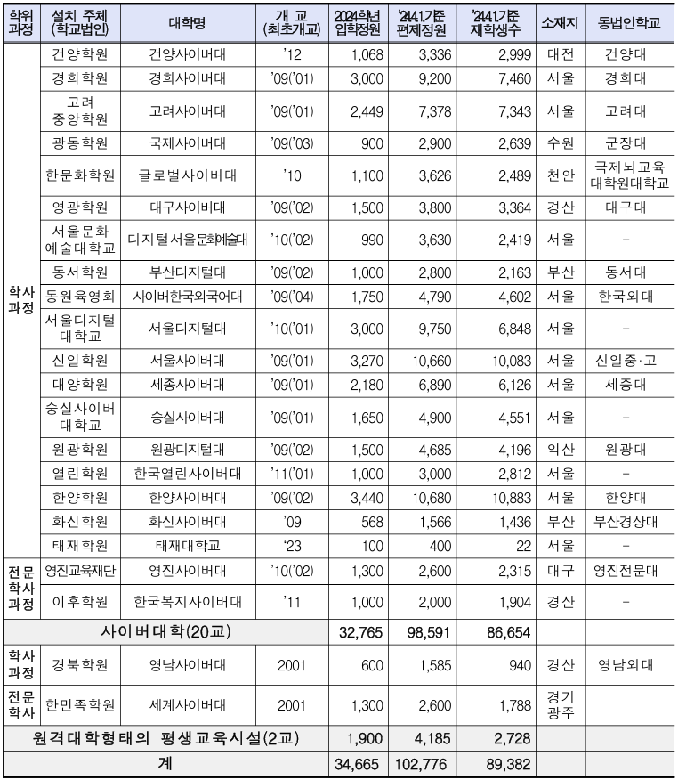 원격대학이란 보통 '사이버대'라고 생각하면 된다. 현행 「고등교육법」에서는 원격대학을 방송대학·통신대학·방송통신대학 및 사이버대학으로 규정하고 있고, 「평생교육법」에 따라 설립 인가를 받은 원격대학 형태의 평생교육시설도 원격대학에 포함된다. 2024년 4월 현재, 원격대학은 고등교육법에 따른 방송통신대학 1개, 사이버대학 20개와 평생교육법에 따른 평생교육시설 2개가 운영되고 있다. 현황은 아래 표와 같다.