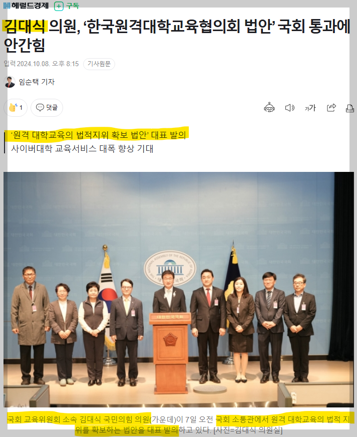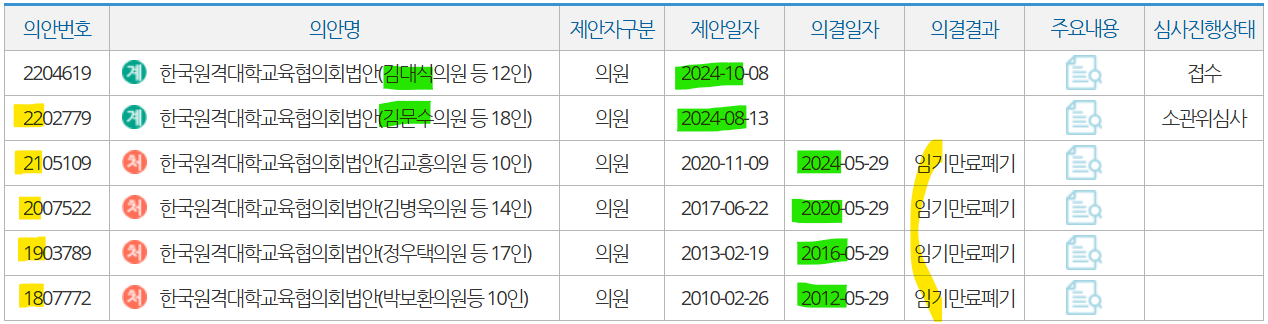 「한국 원격대학 교육 협의회법」(이하 원대협법)을 사이버대의 '숙원'이라고 한 이유는 이 법안이 18대국회부터 22대국회까지 다섯번이나 발의되었기 때문이다. 21대국회까지 4번 발의된 법안은 모두 임기만료로 폐기되었다. 좀 의아한 점은 이 법안이 특별한 쟁점이 있는 것도 아니고, 무슨 논란이 있었던 것도 아닌데 번번이 제정되지 못했다. 22대 국회에서는 과연 통괴될 수 있을까? 무슨 속사정이 있는 것일까?