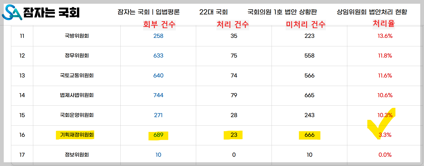 22대 국회 들어 기재위에 회부된(기재위에서 처리해야 할) 법안은 689건이다. 그런데 현재까지 처리한 안건은 23건에 불과하다. 상속세법 개정안을 포함해서 666건은 미처리 상태로 방치되어 있다. 처리율은 고작 3%다. 100점 만점에 3점이라는 뜻이다. 이 정도면 기재위는 없는거나 마찬가지다.