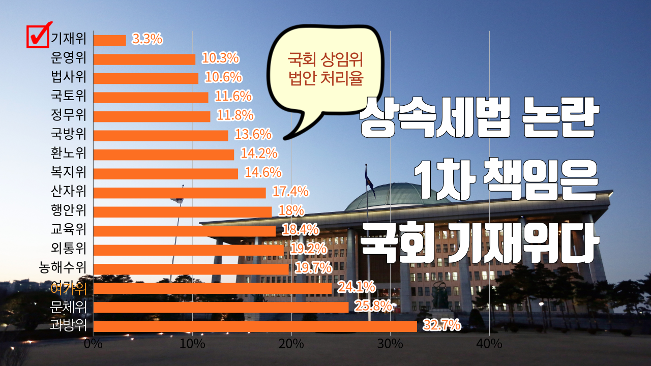 국회 기획재정위원회(기재위)는 상속법 등 각종 세법을 다루는 상임위다. 소관기관으로는 기재부, 국세청, 관세청, 조달청, 통계청, 한국은행 등이 있다. 상속세 부담 완화 문제도 지금처럼 정치적 논란으로 번지기 전에 기재위에서 진작에 논의했어야 했다. 그런데 문제는 기재위가 일을 안한다.