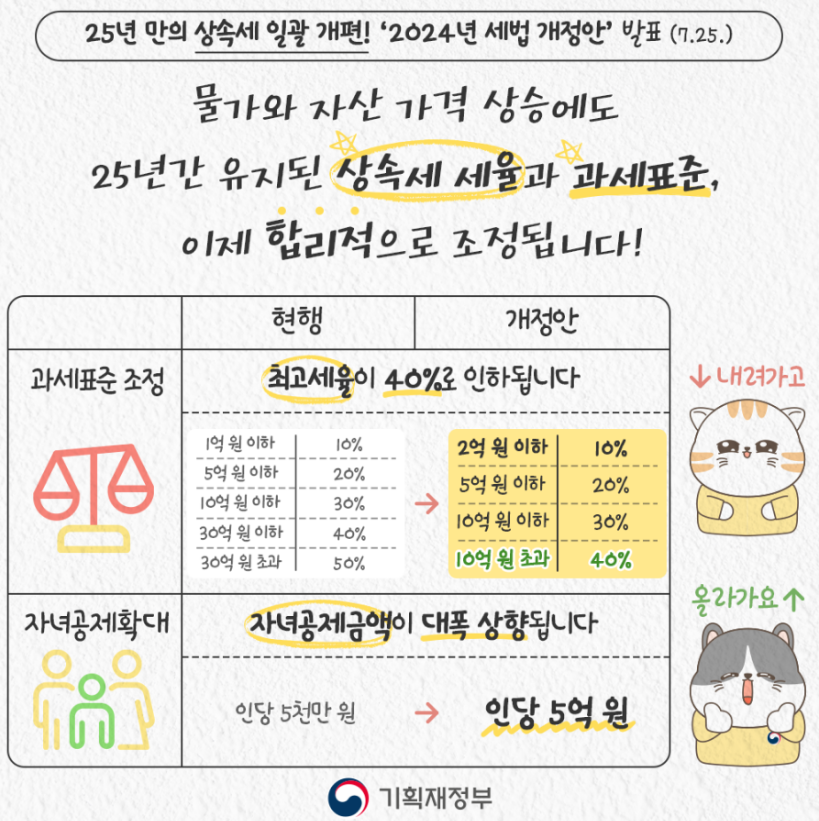이에 정부는 2024년 9월에 상속세 과세표준 구간 및 세율을 조정하는 '상속세 및 증여세법' 개정안을 국회에 제출했다. 최고세율 구간을 현행 (30억 초과 50%)에서 (10억원 초과 40%)로 조정했다.
