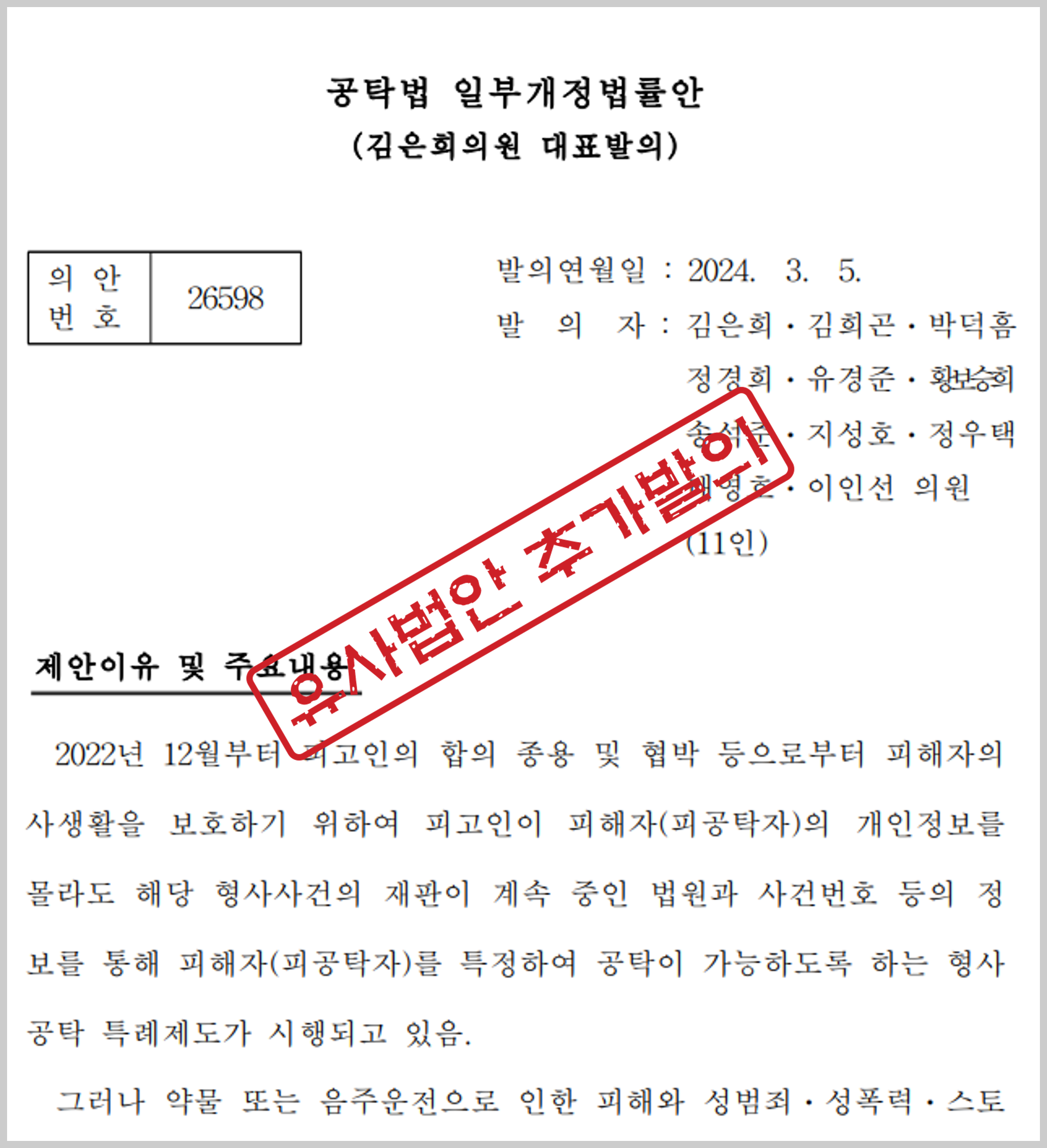 이 법안은 2024년 3월 5일, 김은희 국회의원 외 11인이 발의하였고, 소관 위원회는 법제사법위원회다.