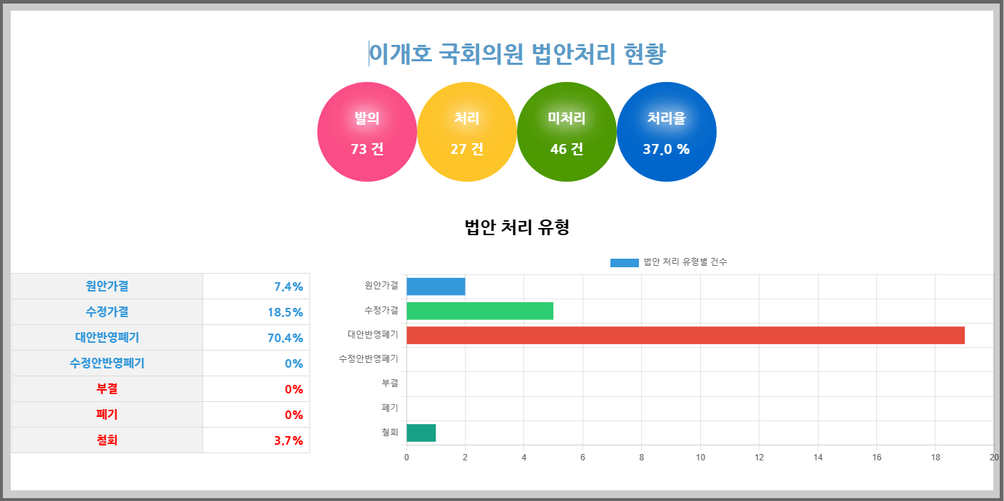 참고로, 2024년 4월 14일 현재, 이개호 국회의원의 21대국회 법안 발의 건수는 73건, 처리 27건, 미처리 46건으로 처리율은 37%를 기록하고 있다.