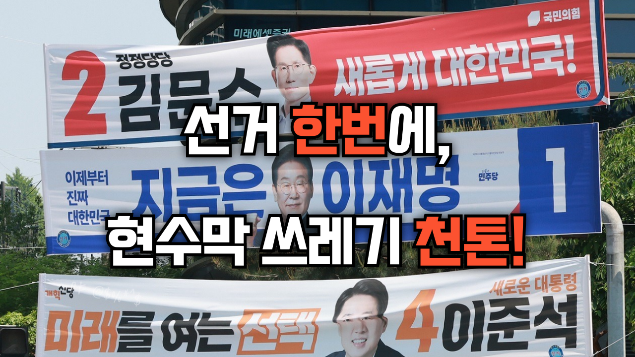 중앙선관위에 따르면, 2022년 제20대 대선에서 1,110톤의 현수막 쓰레기가 발생했다. 그 해 지방선거에서는 1,557톤, 2024년 국회의원 선거에서는 1,235톤의 선거 현수막 쓰레기가 나왔다. 선거를 한번 치를 때마다 1천톤 이상의 현수막 쓰레기가 발생하는 것이다. 이런 정치 현수막의 재활용을 의무화하는 법안이 발의됐다. 재활용도 좋지만 정치·선거 현수막, 이제 아예 없애보는건 어떨까?