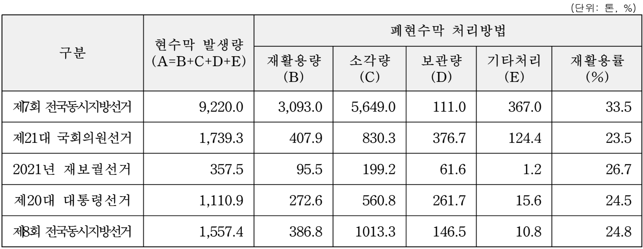 행안부와 환경부의 자료에 따르면 2018년∼2022년 선거에서 발생한 폐현수막은 무려 13,985톤이나 되는데, 재활용률은 24%에서 34% 사이 정도다.