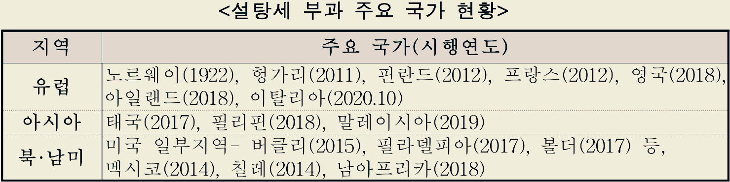 소비자 부담 전가로 물가인상 요인이 될수 있음. 가당음료에만 설탕세를 부과하는 제도는 특정 산업군에 대한 과도한 징벌적 조치로 부작용 우려