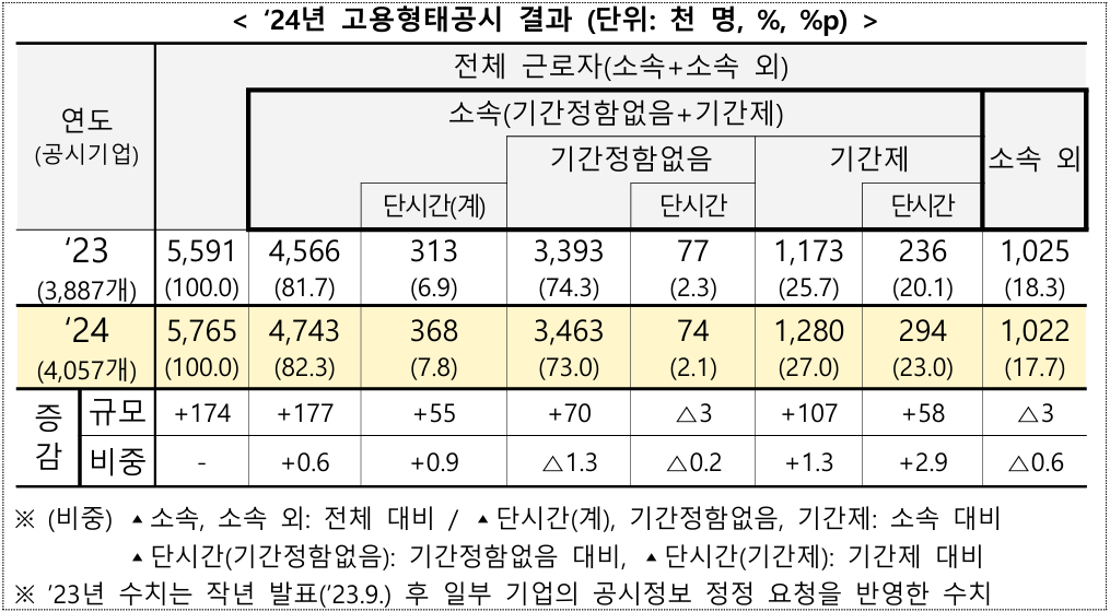 상시 300명 이상 근로자를 사용하는 사업주는 매년 3월 31일 기준 근로자의 고용형태 현황을 4월 30일까지 고용정보시스템(고용형태공시시스템)에 공시하도록 하고 있다. 공시해야 하는 고용형태는 기업규모에 따라 조금 다르다.