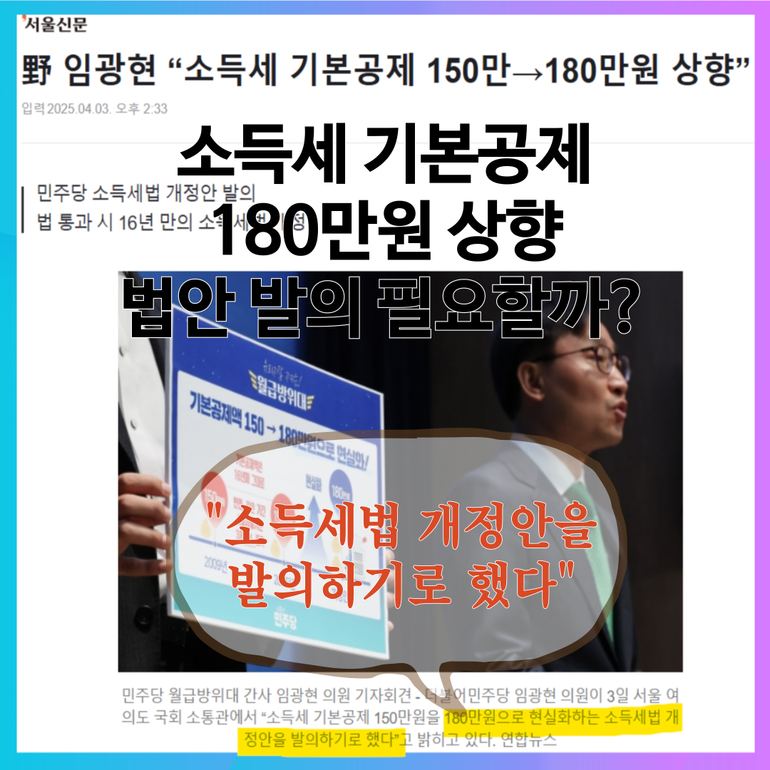 이런 의문이 당연하다. 기본공제액을 200만원, 300만원으로 늘리자는 법안은 있는데, 민주당 계획처럼 180만원은 없다. 그러면 임광현 의원의 말처럼 180만원으로 늘리는 법안을 새로 발의해야 하나?