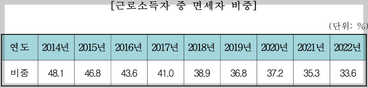 저소득층에게는 도움이 안되는 점도 고려해야 한다. 우리나라의 전체 근로소득자 중 면세점 이하의 저소득자 비율은 2022년 기준 33.6%다. 소득세 기본공제 금액을 아무리 올려봐야 기존의 저소득층 면세자에게는 아무런 혜택이 없다.
