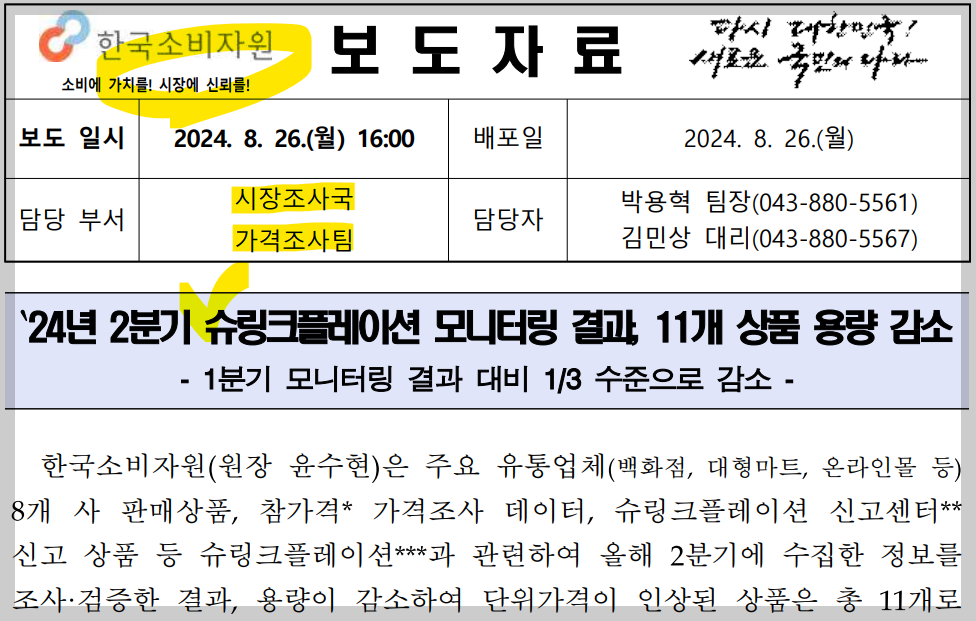 한국소비자원에 따르면 2024년 1분기에 용량감소 상품 33건이 적발된 것에 비하면 용량 축소를 통한 가격 인상 행위가 점차 줄어드는 추세라고는 한다.