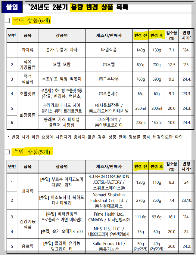 한국소비자원이 금년 2분기에 수집한 정보를 조사·검증한 결과, 용량이 감소하여 단위가격이 인상된 상품은 총 11개로 확인되었다. 국내상품 6개와 수입상품 5개다.