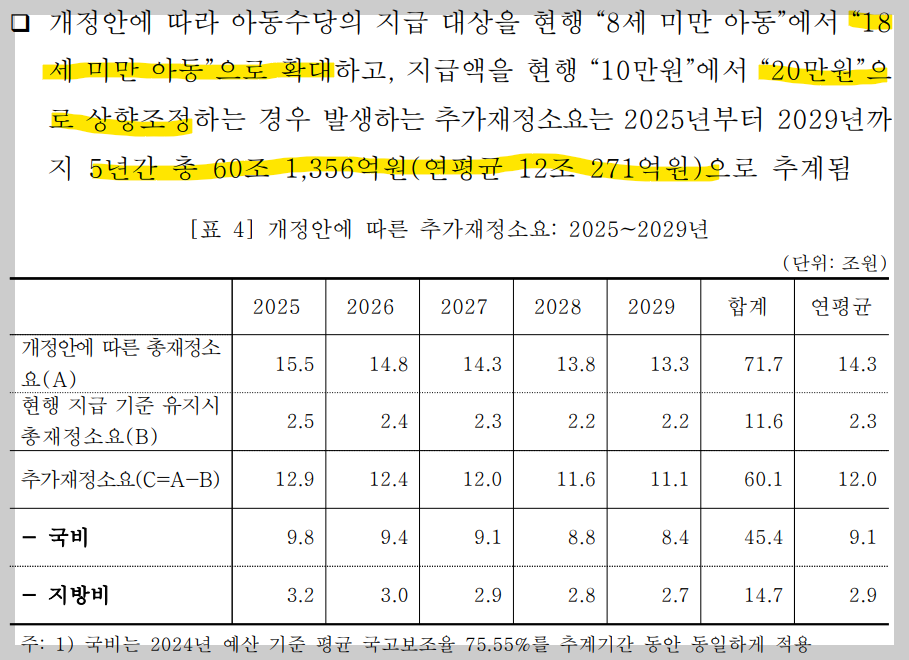 국회의원들이 법안을 발의할 때 재정부담이 소요되는 법안의 경우 비용추계서를 붙이도록 되어있다. 즉, 이 법안이 통과될 경우 대략 얼마나 돈이 드냐를 미리 계산해 보는 것이다. 22대 국회에서 가장 먼저 아동수당법을 발의한 전진숙 의원의 경우(18세 미만, 월 20만원) 국회예산정책처는 추가 재원 소요를 향후 5년간 60조 1,356억으로 추계하였다.