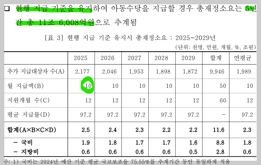 국회의원들이 법안을 발의할 때 재정부담이 소요되는 법안의 경우 비용추계서를 붙이도록 되어있다. 즉, 이 법안이 통과될 경우 대략 얼마나 돈이 드냐를 미리 계산해 보는 것이다. 22대 국회에서 가장 먼저 아동수당법을 발의한 전진숙 의원의 경우(18세 미만, 월 20만원) 국회예산정책처는 추가 재원 소요를 향후 5년간 60조 1,356억으로 추계하였다.