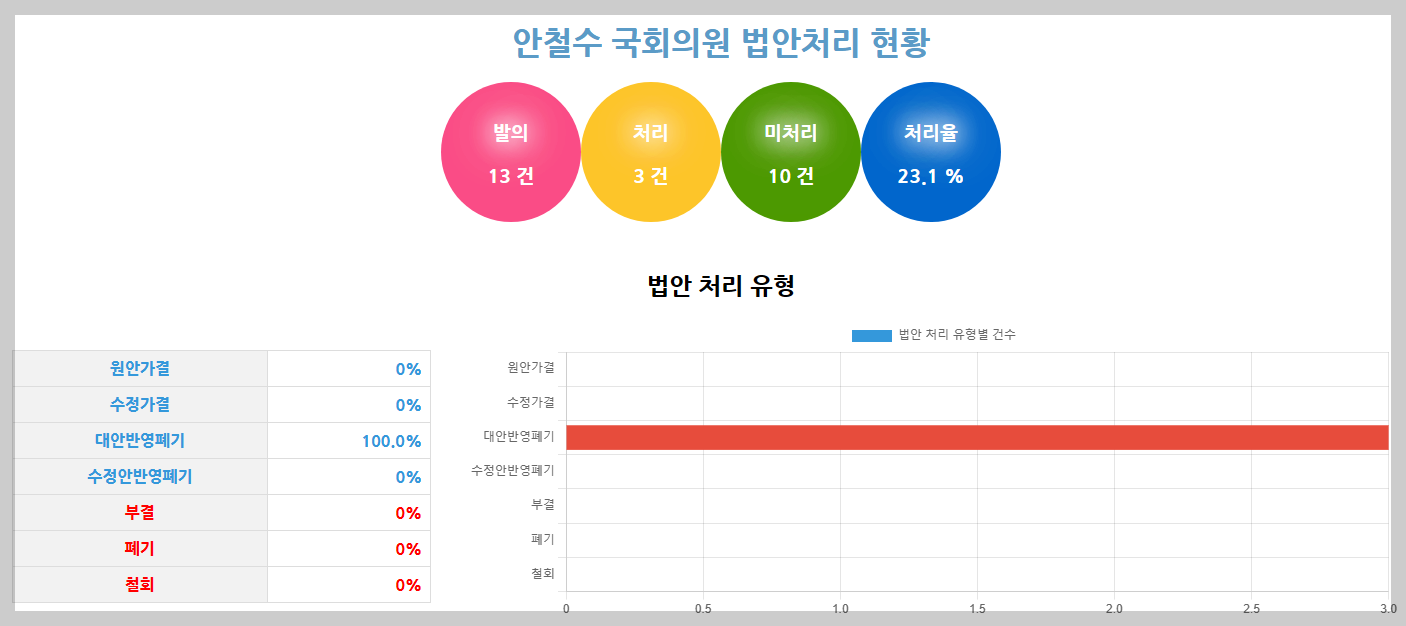 안철수 의원의 21대국회 법안 발의 건수는 13건, 이 중 처리는 3건으로 다소 미흡한 편이다. 처리율은 23.1%다. 다만, 안철수 의원은 2022년 6.1일 보궐선거에서 분당(갑) 의원으로 당선되었다. 재임기간이 약 2년 정도임을 감안해서 보면 좋겠다.