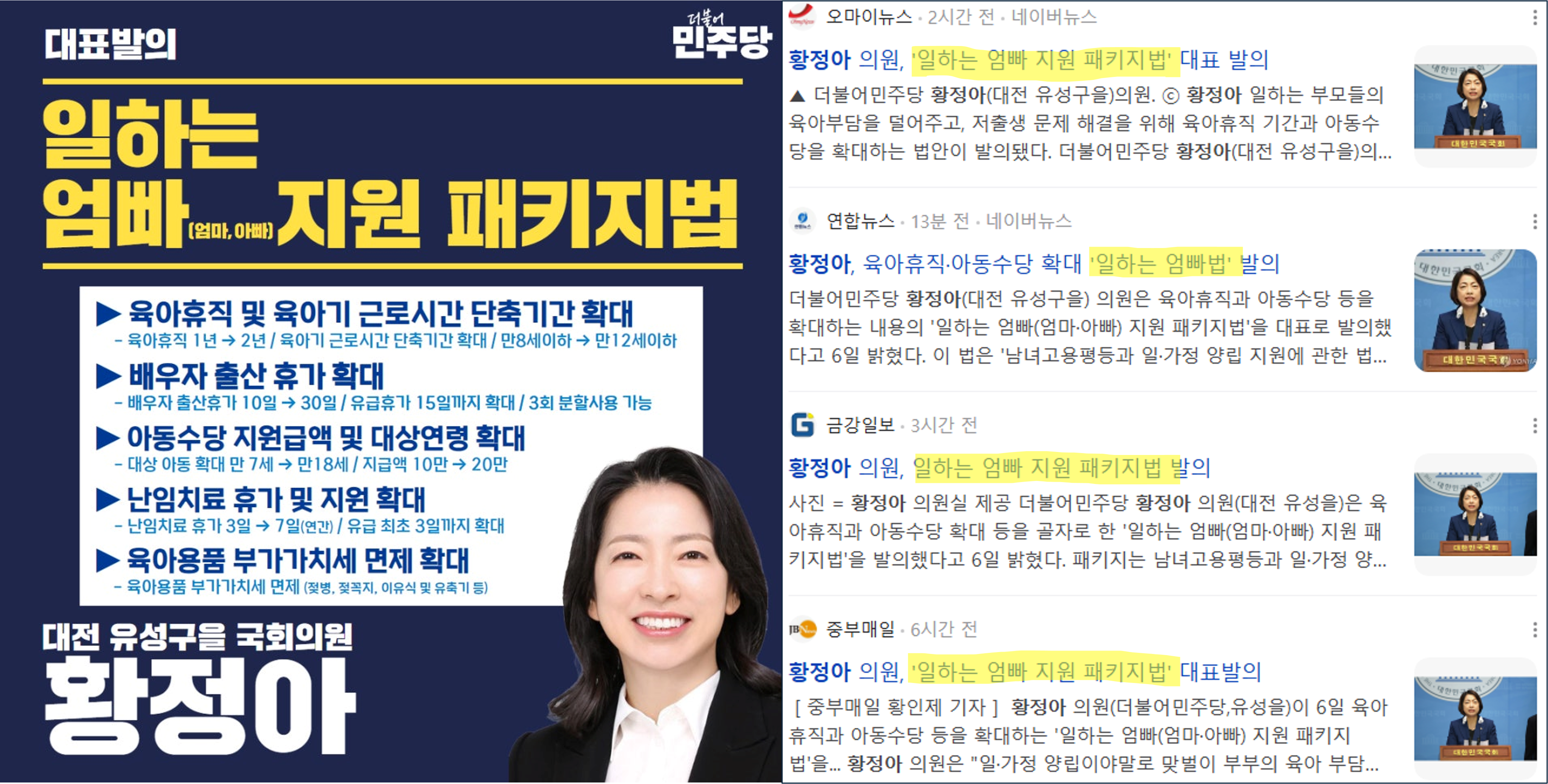 <위 표>를 보면 황정아 의원이 발의한 개정안 내용 중에서 이미 발의된 법안의 내용과 다른 부분은 난임치료 휴가를 연간 7일로 한 것. 오직 이것 하나 뿐이다. 그럼에도 불구하고 황정아 의원은 이 법안이 '엄빠(엄마·아빠) 지원 패키지법'이라며 홍보하고, 일부 언론은 이를 열심히 기사로 받아준다.