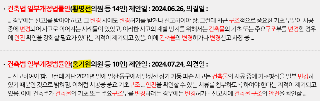 건축주가 건물을 지을 때 '기초' 또는 '주요구조부'를 변경하려면 구조의 안전을 확인할 수 있는 서류를 의무적으로 제출하라는 법안이다. 여기서 '주요 구조부'라 함은 건축물의 기둥이나 내력벽을 말한다. 현행법에서는 '기초' 변경은 경미한 사안으로 별도의 변경절차가 없고, '주요 구조부' 변경은 사용승인 신청 시 일괄 신고하면 된다. 이에 대한 규제를 강화하여 ‘기초’ 또는 ‘주요구조부’를 변경하려는 경우 건축물의 구조안전을 증빙하는 서류 제출을 의무화 하는 법안이다. 황명선, 홍기원 의원이 발의했다. 그간의 입법공백을 보완하는 법안인데, 이를 '민생법안'이라고 하기에는 좀 억지스럽다.