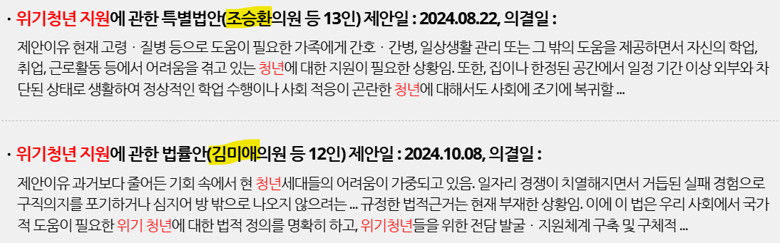 가족돌봄을 위해 자신의 학업, 취업, 근로활동 등에서 어려움을 겪고 있는 청년, 고립·은둔청년 등 위기에 처한 청년 지원을 위해 국가와 지방자치단체의 책무를 명시하고 이들에 대한 종합적인 지원체계를 마련하기 위한 법안이다. 위기청년 전담 지원체계 구축 법안이라고 할 수 있다. 청년들이 정상적으로 사회에 진출할 수 있는 기회를 보장하고 사회구성원으로서 안정적인 삶을 살아가도록 하겠다는 취지다. 기존의 위기청년 지원정책에 대해 법률체계를 정비하는 차원이라고 생각한다. 민생법안이라고 볼 수 있는지는 여러분의 판단에 맡긴다.