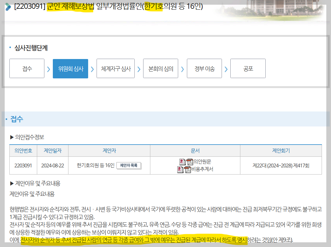 공무원 재해보상법 개정안은 박대출, 유용원, 김상욱, 강선영, 권향엽 의원이 발의했다. 군인 재해보상법 개정안은 한기호 의원이 발의했다. 순직자에 대한 예우를 합리적으로 바로잡는 법안은 맞는데, 이걸 '민생법안'이라고 할 수 있나?