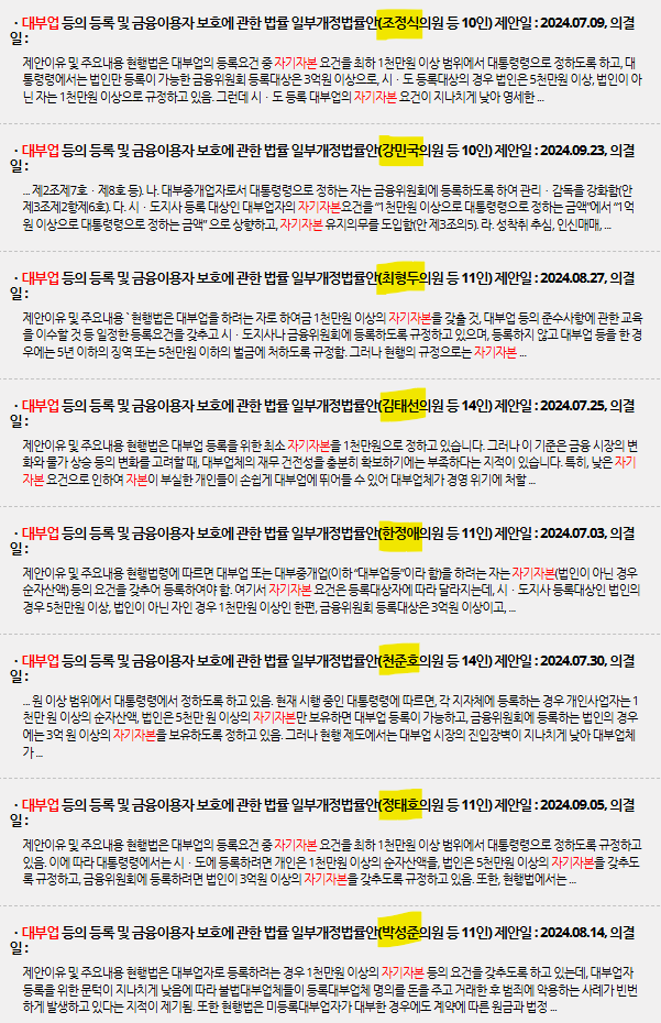대부업 등록(시도지사) 시 자기자본(순자산액) 요건을 현행 1천만원(개인)에서 1억원 이상으로 올리는 것이다. 대부업 등록 요건이 너무 허술하여 영세 대부업자가 난립하고, 인권유린에 가까운 불법추심을 자행하여 사회적 물의를 일으키고 있다. 이에 등록 요건을 강화하여 사실상 무자격 대부업체의 난립을 막겠다는 취지로 보인다. 한정애, 조정식, 김태선, 강민국, 최형두, 천준호, 정태호, 박성준 의원이 발의했다. 물론 필요한 법안이라고 생각하지만, 대부업자에 의존하지 않도록 대책을 세우는 것이 진짜 '민생법안' 아닐까?