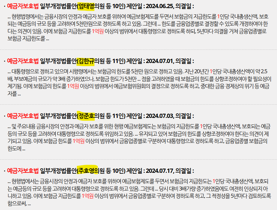 예금보호 한도를 기존 5천만원에서 1억원으로 올리는 것이다. 엄태영, 신영대, 정준호, 김한규, 주호영 의원이 발의했다. 예금 보호한도가 5천만원으로 정해진 2001년 이후 국내 경제가 지속적으로 성장한만큼 예금 안정성을 위해 한도를 1억원 이상으로 높여야 한다는 것이다. 그런데, 은행의 경우 5천만원 이하 예금자 비중이 98%인데, 이게 과연 '민생법안'인지 다소 의문이다. 고액예금자가 혜택을 받는 것은 확실하다. 그러나 한도 상향으로 예금보험료율이 인상되면 그 부담은 모든 예금자가 나누어 져야 한다.