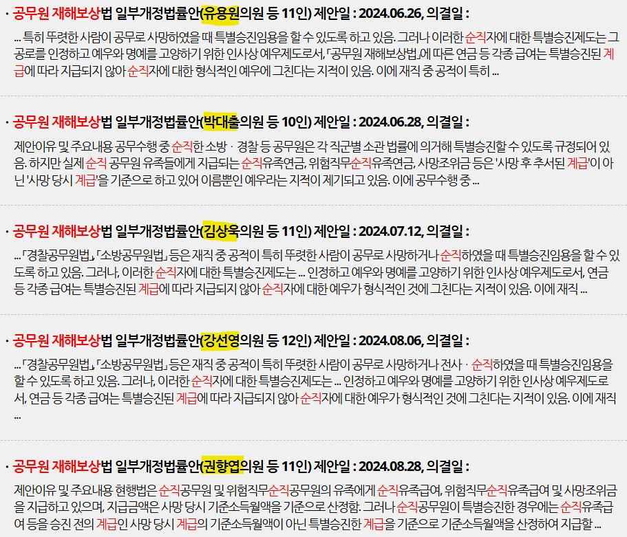 공무원 재해보상법 개정안은 박대출, 유용원, 김상욱, 강선영, 권향엽 의원이 발의했다. 군인 재해보상법 개정안은 한기호 의원이 발의했다. 순직자에 대한 예우를 합리적으로 바로잡는 법안은 맞는데, 이걸 '민생법안'이라고 할 수 있나?