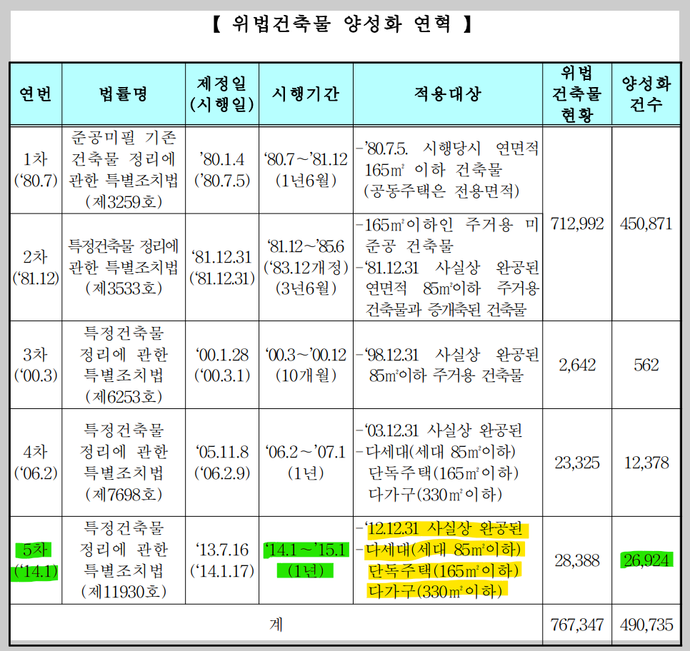 마지막 5차는 2014년에 1년 동안 시행되었는데, 문제는 당시 이런 법과 제도에 대해 알지못해 양성화 혜택을 받지 못한 사람이 생각보다 많다는 것이다. 이런 사정을 고려해 마지막 양성화조치 10년 만에 한번 더 위법건축물 양성화를 추진하기 위해 관련 법안이 발의되었다.