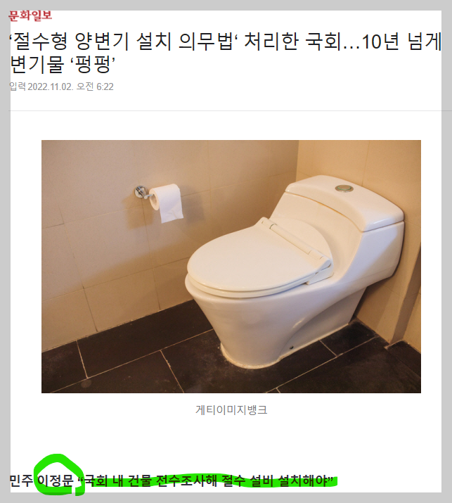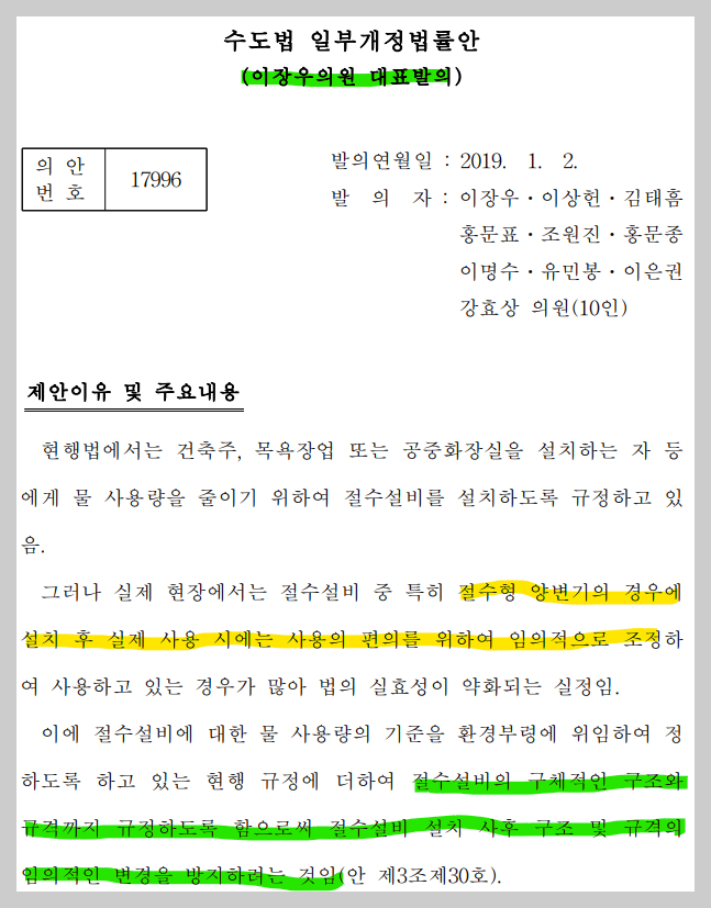 화장실 등에서의 물 사용량을 줄이기 위한 「수도법」 개정은 이전에도 이미 다양한 문제제기가 있었고 관련 법개정도 지속적으로 이루어졌다. 지난 20대 국회에서 이장우 의원도 유사한 취지로 수도법 개정을 추진했다. 또한 2022년 국정감사에서는 이정문 의원이 국회 화장실 절수설비가 제대로 갖추어지지 않아 변기물이 낭비되고 있다는 지적을 하기도 했다. 아마 이후 이에 대한 조치가 있었던 것으로 안다.