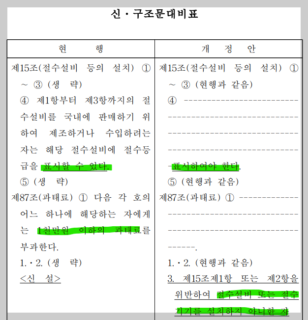 이 법안은 왼쪽 예시와 같은 절수 등급 표시를 지금까지의 '선택'에서 '의무'로 전환하여 화장실 등에서 낭비되는 수돗물의 절약을 촉진한다는 취지다. 원래 절수등급 표시제는 2019년에 도입되었는데, 여전히 절수설비에 대한 인식이 부족하고, 비용 절감을 위해 절수등급이 낮은 제품을 설치하는 문제 등이 개선되지 않고 있는 실정을 고려하여 법 개정이 추진된 것으로 이해한다.