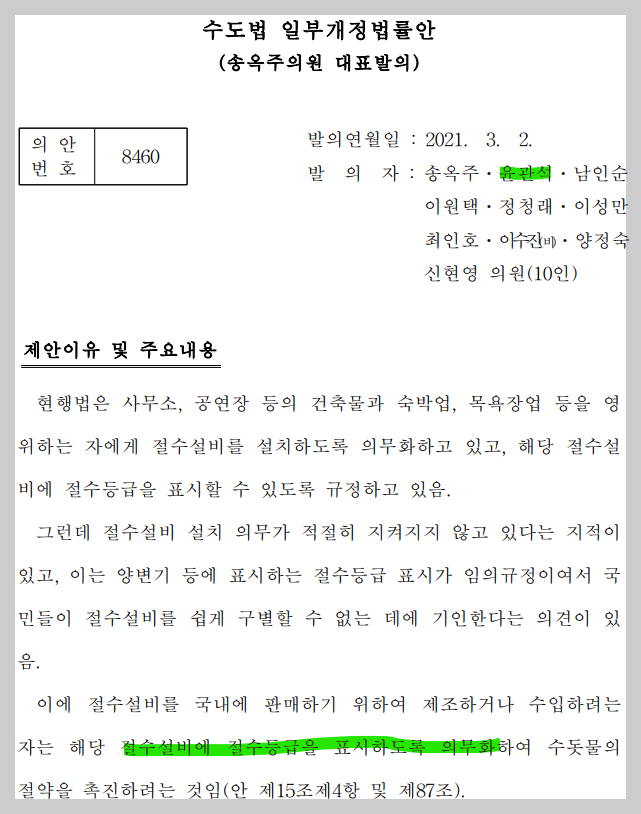검찰이 의심하고 있는 수도법 개정안이다. 윤관석 의원이 공동발의 명단에 들어있다. 이 법안은 화장실 양변기 등의 절수설비에 절수등급 표시를 의무화하는 내용이다. 참고로 절수설비 설치 의무화는 2002년 4월부터 시행되었다.