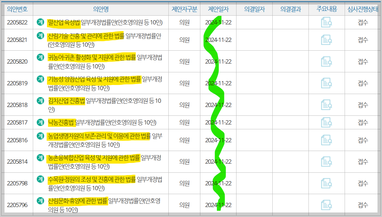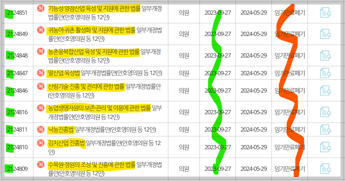 왜 하필 농해수위 소관 법안일까? 안호영 의원은 21대국회 하반기에 농해수위 위원이었다. 위 10개의 법안은 당시 농해수위 위원으로서 발의했던 법안이다. 당연한 결과라고 생각하는데, 모두 임기만료로 폐기되었고 22대 국회에 들어와 폐기된 법안을 그대로 다시 발의한 것 뿐이다.