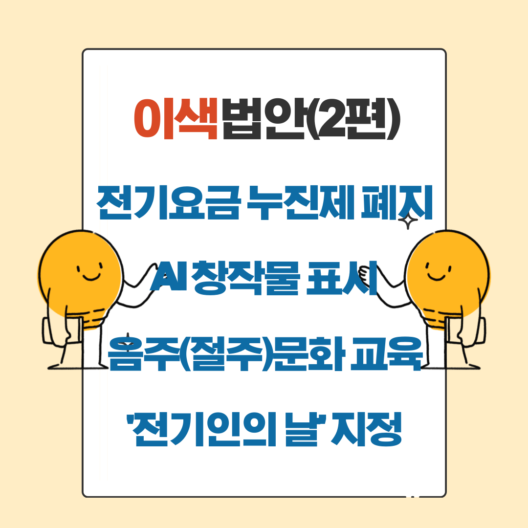 「전기사업법」 개정안이다. 곽상언 의원이 발의했다. 「전기사업법」 제16조(전기의 공급약관)에 "전기판매사업자는 전기요금을 정하는 경우 용도별차등요금제나 누진요금제를 규정하여서는 아니 된다."는 조항을 신설한 법안이다. <용도별차등요금제>란 주택용이나 산업용 등 전기의 사용 용도를 구분하여 사용 용도에 따라 서로 다른 요금단가를 적용하는 요금제도다. <누진요금제>는 전력 사용량에 따라 구간을 나누어 구간별 요율을 증가시키는 요금단가를 적용하는 요금제도다.