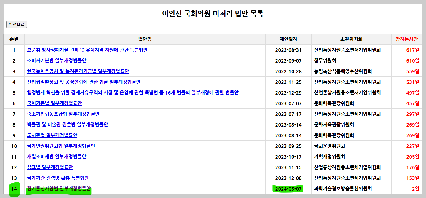 예상컨데, 이인선 의원이 5월 7일 발의한 「전기통신사업법 개정안」은 그냥 과방위원회에 회부만 된 상태에서 21대국회 임기만료와 함께 폐기될 것이다. 아마도 이인선 의원은 22대 국회가 되면 이 법안을 다시 제출할 가능성이 크다. 그렇게 되면 22대 국회 이인선 의원 법안 발의 건수가 1건 추가된다.