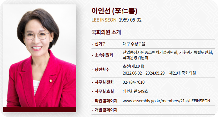 이인선 의원은 2022년 6월 보궐선거에서 당선되어, 22대 총선에서 재선에 성공했다. 대구경북과학기술원장(DGIST), 경북 정무·경제부지사, 대구경북 경제자유구역청장 등을 역임했다. 이인선 의원의 21대 국회 임기 2년 동안의 입법활동을 살펴본다.