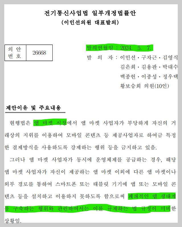 이 법안은, 소위 '애플저격법'이라고 불리는 법안이다. 갤럭시 폰 이용자는 플레이스토어나 제3의 앱마켓을 이용해서 앱을 설치할 수 있는데, 아이폰은 앱스토어를 통해서만 앱을 설치할 수 있다. 이렇게 OS 사업자의 폐쇄적 앱마켓 운영을 규제하겠다는 내용이다. 문제는 법안의 타당성을 떠나, 이미 유사한 법안들이 발의되어 있다는 점이다.