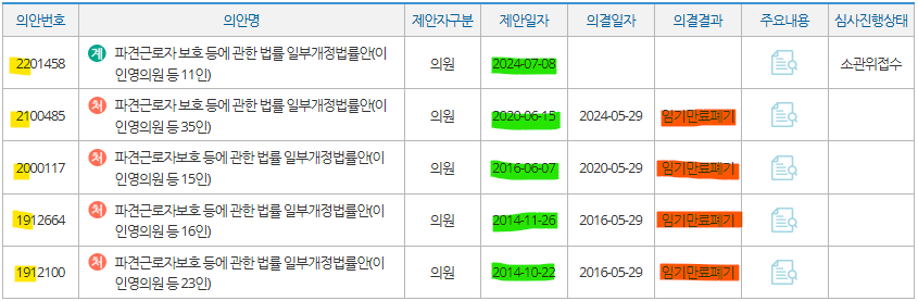 이인영 의원 대표발의 「파견근로자 보호 등에 관한 법률」 개정안 역시 4수에 도전중이다. 결국 위 3개의 법률안은 10년째 계류중인 '4수 동기들'이다.