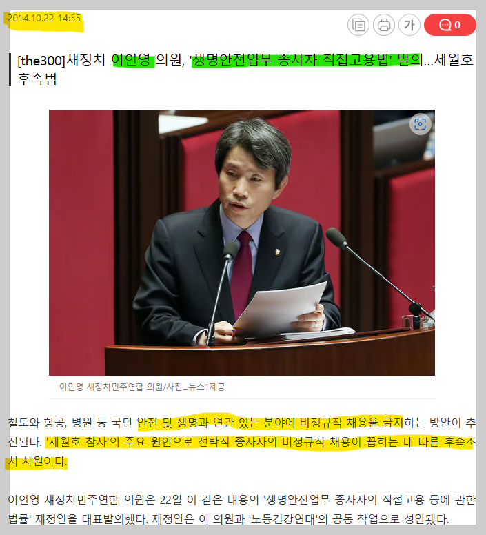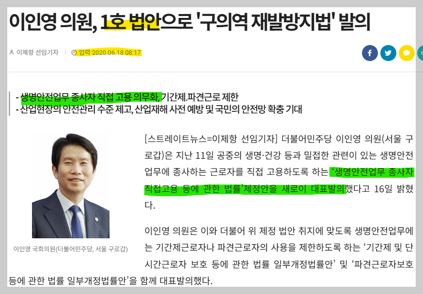 이인영 의원은 이 법률안에서 사람의 생명·건강 등에 유해하거나 위험한 작업 등을 생명안전업무로 규정하고 있다. 나아가 해당 업무에서는 근로자를 직접고용하게 함으로써 산업현장의 안전관리 수준을 높혀 산업재해를 예방한다는 취지다. 5선의원다운 통찰력을 담은 좋은 법안이라고 생각한다.