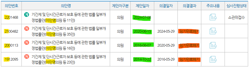 이인영 의원 대표발의 「기간제 및 단시간근로자 보호 등에 관한 법률」 개정안도 19대 국회부터 추진되었으나 계속 임기만료로 폐기되었다. 역시 4수에 도전하고 있다.