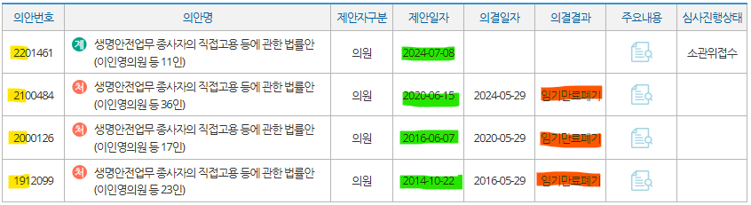 그런데 문제는, 이 생명안전업무 법률안은 21대국회(2020.5.30~2024.5.29)에서도 이인영 의원의 제1호 법안이었다. 2020년 6월 15일, 이인영 의원은 같은 법률안을 발의했으나 결국 21대국회 임기만료와 함께 폐기되었다. 뭔가 활발하고 적극적인 논의가 있었던 것도 아니다. 이 법률안은 2020년 12월 3일, 환경노동위원회 고용노동법안심사 소위에서 잠깐 언급된 적은 있지만, 이후 단 한번도 제대로 논의된 적이 없다. 무려 1,272일 동안 방치되다가 결국 폐기되었다.