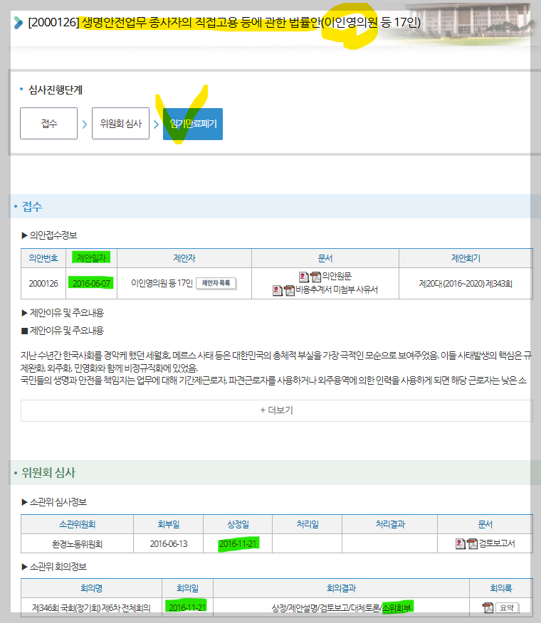 그런데 더 더 문제는 이 법률안이 이미 19대국회(2012.5.30~2016.5.29)에서 발의되었던 법률안이라는 것이다. 이인영 의원이 생명안전업무 법률안을 최초 발의한 것은 2014년 10월 22일이다. 아마도 비극적인 세월호 사태를 계기로 "국민의 생명과 안전을 책임지는 업무에 대해서는 기간제근로자, 파견근로자, 외주용역에 의한 인력을 사용하지 못하도록 하는 법안"을 구상했던 것으로 보인다. 당시 발의한 이 법안은 2015년 3월 2일, 환노위 소위에 회부된 뒤 아무런 진전이 없이 19대국회 임기만료와 함께 폐기되었다. 방치기간은 454일이다.