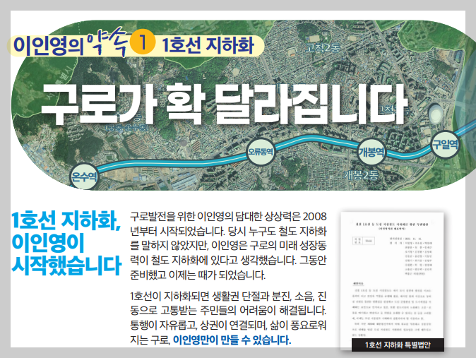실제로 이인영 의원은 그렇게 말했다. 이번 총선 공보를 보면 본인이 발의한 특별법안의 이미지와 함께 "1호선 지하화를 시작했다"고 밝히고 있다.