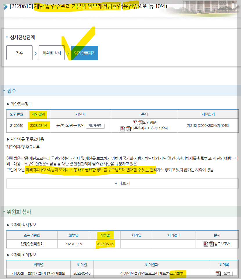 당시 행정안전부는 이미 재난 피해자 유가족이 법인이나 단체를 구성할 권리가 있고, 「비영리 민간단체 지원법」 등을 통해 재정적 지원을 받을 수 있다는 이유로 이 법안에 대해 반대했는데, 22대 국회에서 윤건영 의원이 이를 어떻게 극복할지 지켜볼 필요가 있다.