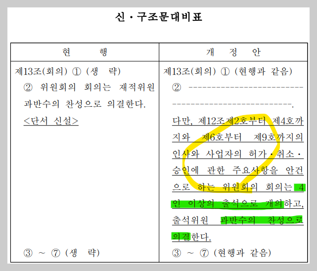 제13조(회의) ① 위원회의 회의는 2인 이상의 위원의 요구가 있는 때에 위원장이 소집한다. 다만, 위원장은 단독으로 회의를 소집할 수 있다. ② 위원회의 회의는 4인 이상의 위원의 출석으로 개의하고, 출석위원 과반수의 찬성으로 의결한다. |