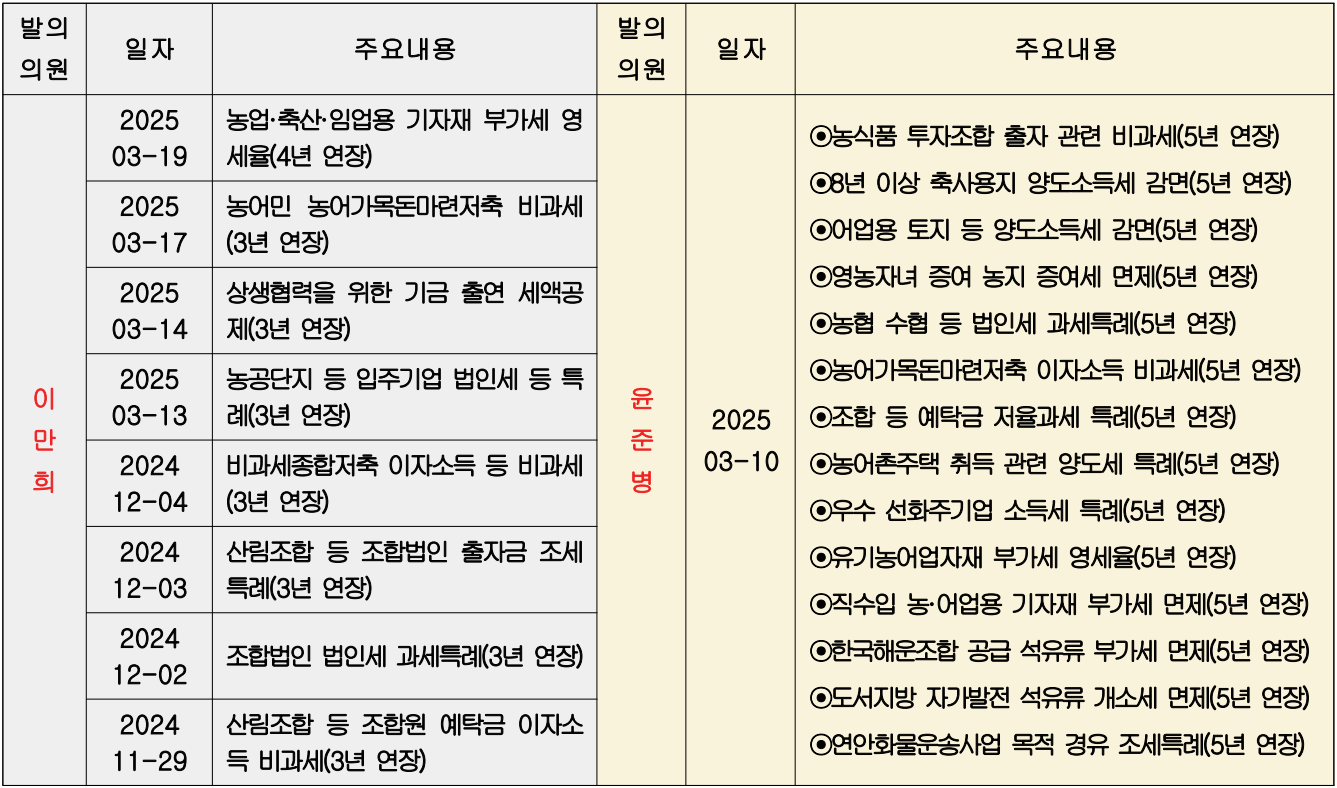 | 엄태영 | 2025-01-15 | 농어민·임업인 수입 기자재 부가세 면제(3년 연장) |