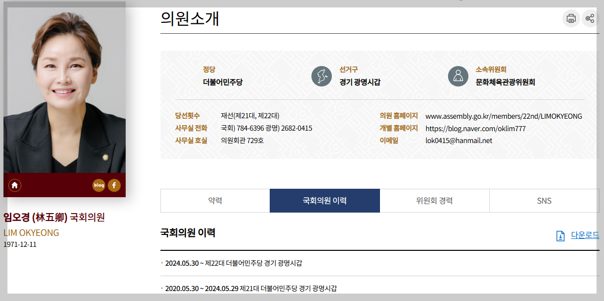 임오경 의원 프로필: 출처_대한민국국회 홈페이지