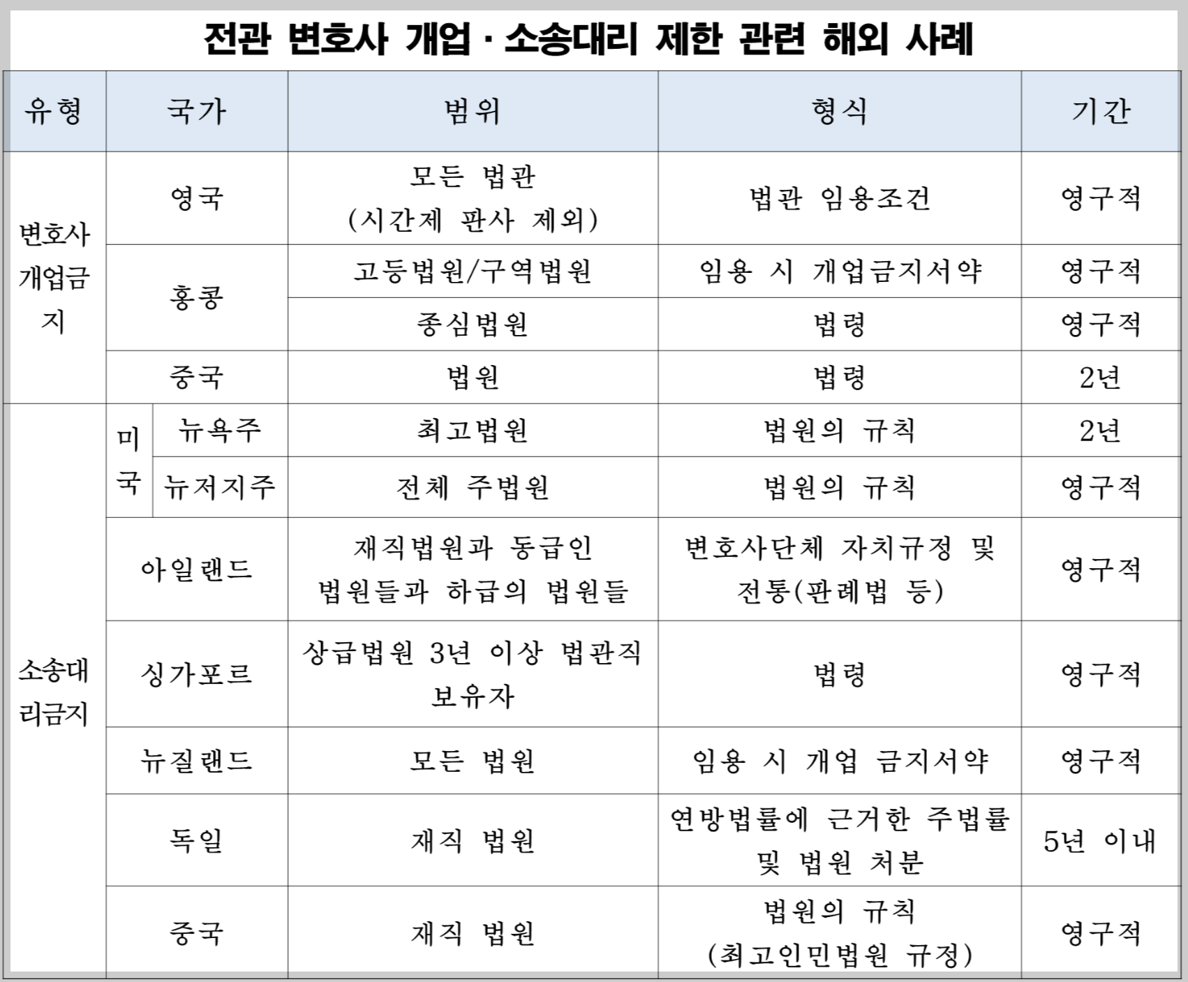 해외 사례를 보면 불가능하지는 않아 보인다. 영국의 경우 모든 법관에 대해 영구적으로 변호사 개업을 금지시키고 있다. 참고로, 같은 취지의 법안을 21대 국회에서 김용민 의원이 발의(2020-9-10)했는데, 이 법안은 제대로 논의 한번 하지 못하고 임기만료로 폐기됐다. 이 법안에서 김용민 의원은 대법원장, 대법관, 법원행정처 차장, 각급 법원장, 헌법재판소장, 헌법재판관, 검찰총장, 대검찰청 검사급 이상 검사 등은 아예 변호사 개업을 하지 못하도록 했다.