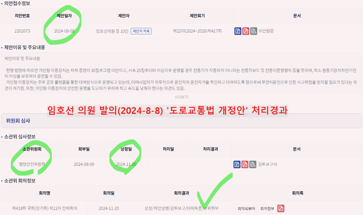 전동킥보드의 "최고속도를 현행 시속 25킬로미터에서 20킬로미터로 하향"하는 법안은 임호선(2024-8-8), 조인철(2024-9-26) 의원이 발의했다.