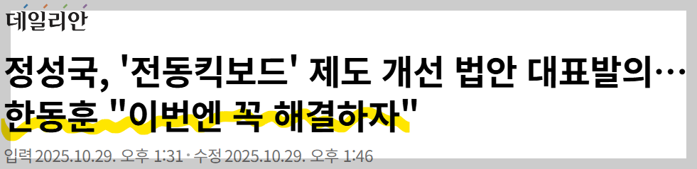 지난 10월 29일, 정성국 의원이 전동킥보드 규제 강화 법안을 발의하자 한동훈 전 대표가 "현실의 문제다. 이번에 꼭 해결하자. 더불어민주당도 반대할 이유가 없다"는 페이스북 메시지를 냈다. 현실을 잘 알고 하시는 말씀인지 살짝 의심된다.