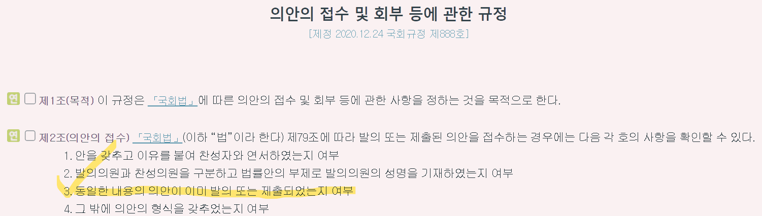 우선, 국회규칙에서 동일한 법안은 추가로 발의할 수 없도록 하고 있다. 구체적으로는 국회의 '의안의 접수 및 회부 등에 관한 규정'에서 정하고 있다.